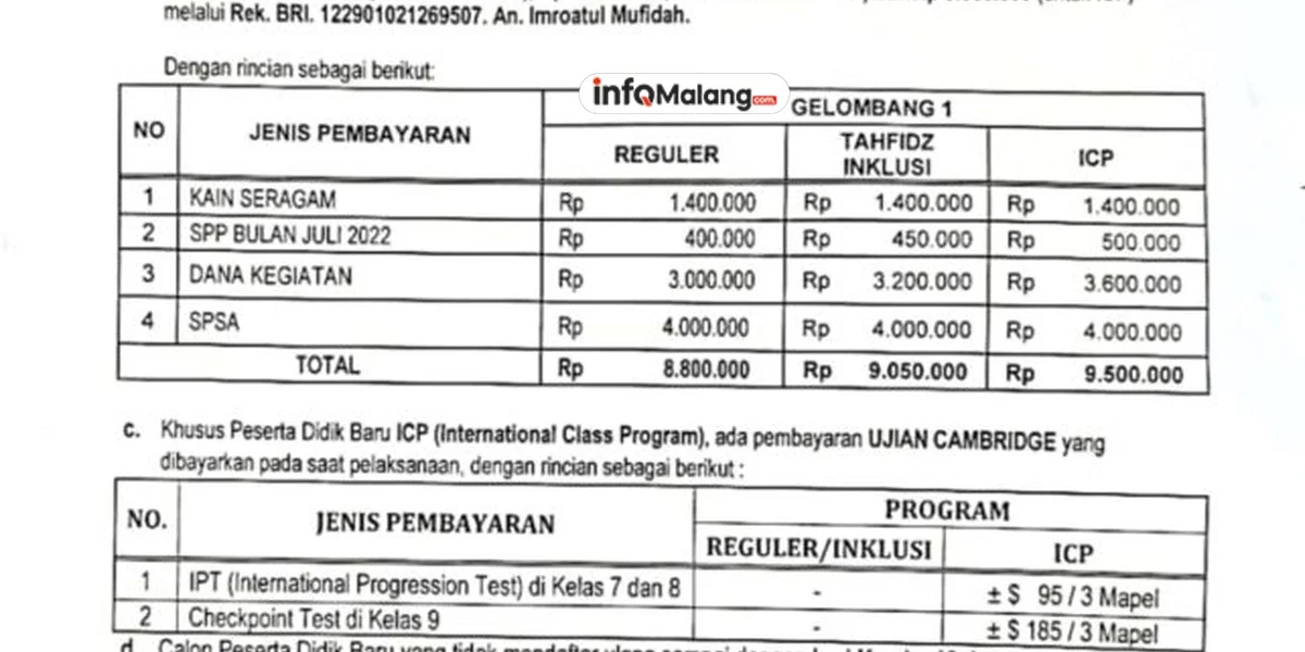 - Billingual: Rp 250.000 (pendaftaran) + Rp 2.000.000 (kegiatan) + Rp 12.000.000 (SPSA) = Rp 14.250.000
