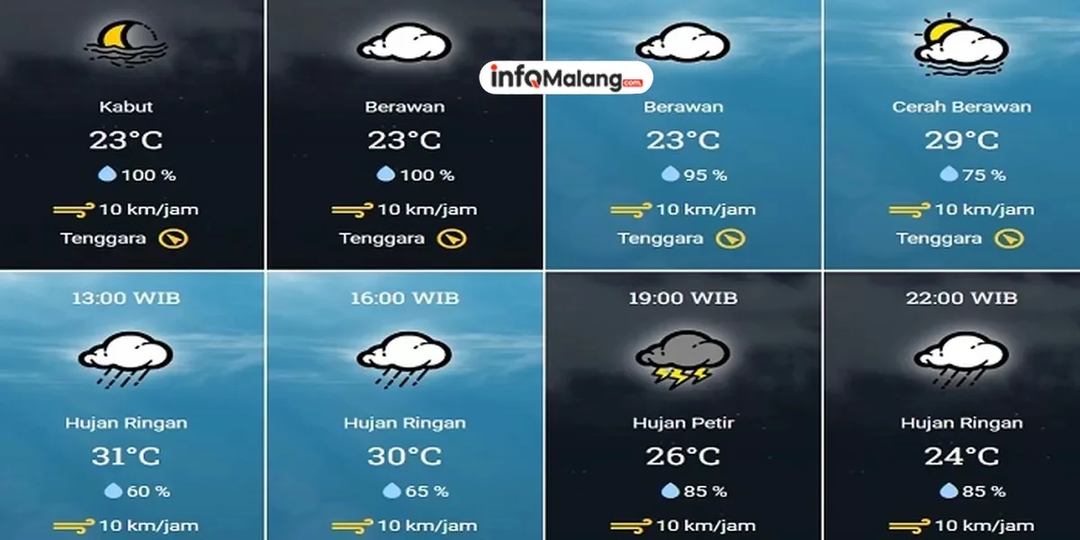 BMKG Juanda melaporkan bahwa kota Malang pagi hari mulai pukul 07.00 sampai 09.00 WIB cuaca cerah dan cerah berawan. “Memasuki pukul 10.00 cuaca di kota Malang cerah berawan,” dikutip dari laman resmi BMKG Juanda.Cuaca cerah berawan terjadi pada siang hari pukul 13.00 WIB. Sore hari cuaca cerah berawan. Malam hari cuaca di kota Malang udara kabut, cerah dan cerah berawan.