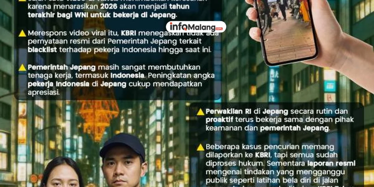 MALANG –Kedutaan Besar Republik Indonesia (KBRI) di Tokyo membantah informasi yang beredar di media sosial mengenai larangan masuk bagi pekerja migran Indonesia ke Jepang mulai tahun 2026. Narasi tersebut menyebutkan bahwa Indonesia akan masuk daftar hitam (blacklist) Jepang dan tidak lagi mengizinkan tenaga kerja asal Indonesia bekerja di Negeri Sakura.